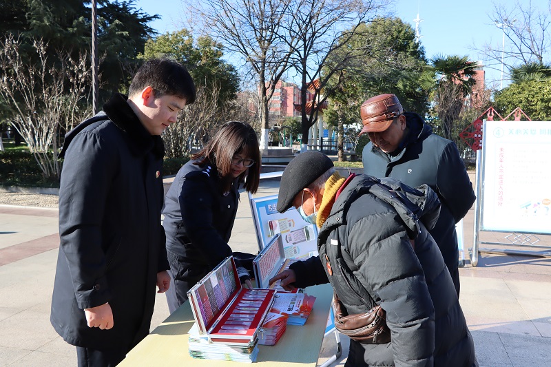 12月26日,在县人民广场开展“关爱明天、普法先行”主题法治宣传活动,干警立足未成年人身心特点,聚焦网络安全、预防校园欺凌、毒品防范等热点问题,结合办理的典型案例,用通俗易懂的语言向家长讲解网络诈骗识别技巧、不法侵害应对方法和求助途径,普及毒品危害及伪装形式等知识。